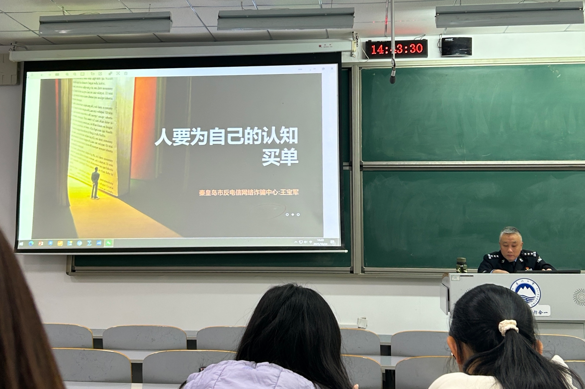 10月24日下午,秦皇岛市公安局海港分局燕园派出所社区民警王宝军走进校园,在工学馆104室开展反诈知识专题讲座,以专业讲解为我院大一学子筑牢反诈骗防线。