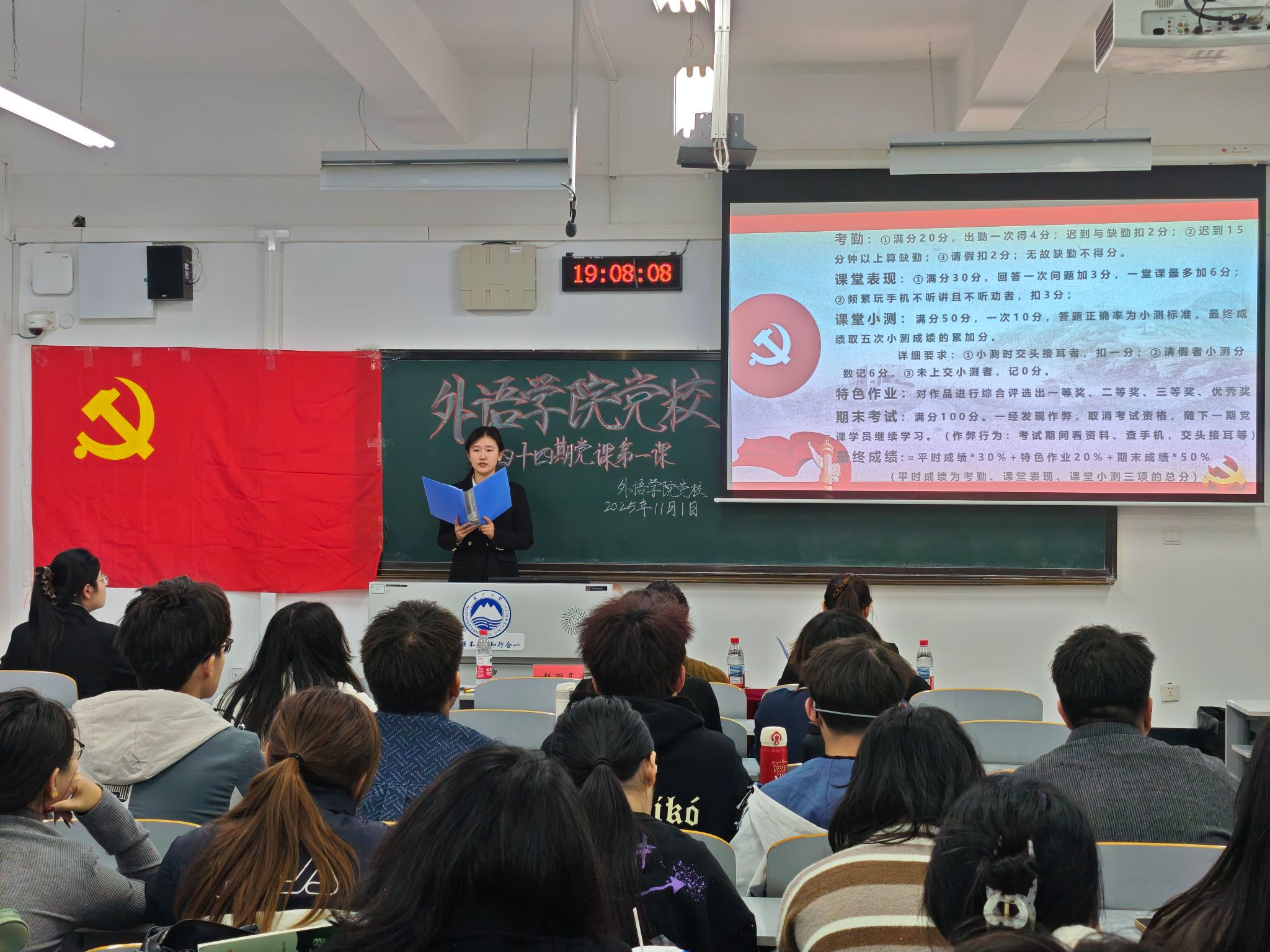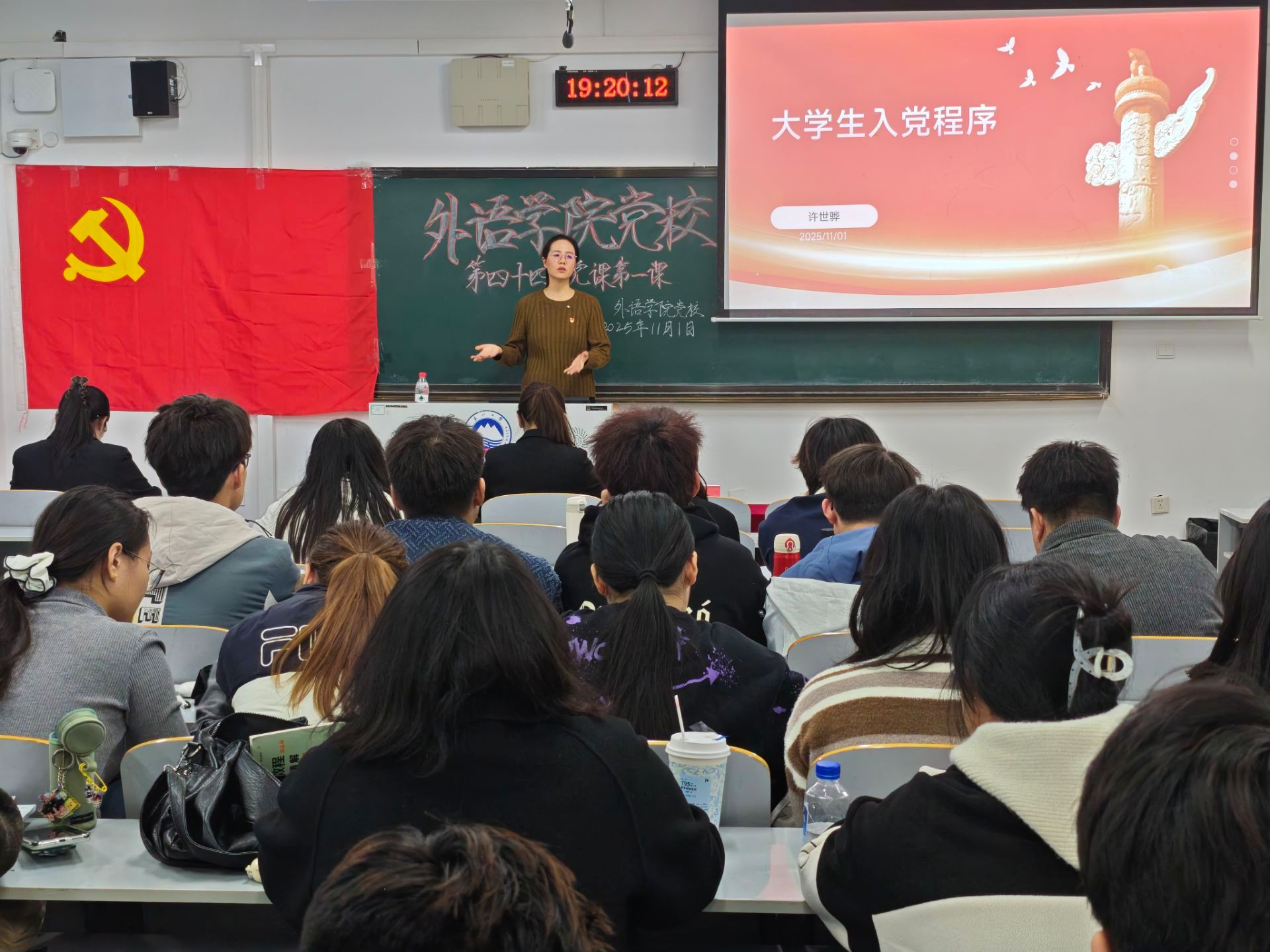 许世骅老师以“从思想认同到组织接纳——大学生入党程序解析与成长问题指南”为主题讲授第一课。她从端正入党动机、夯实理论基础出发,结合具体案例阐释了正确入党动机的内涵,强调理论学习的重要性,并鼓励学员始终保持奉献精神,践行服务宗旨。随后,她详细讲解了入党程序中申请、培养、发展和转正四个阶段的具体步骤与要求。最后,许世骅老师结合外语专业的就业前景与发展需求,对学员们提出期望,希望大家在追求思想进步的同时,不断加强专业学习,实现全面发展。