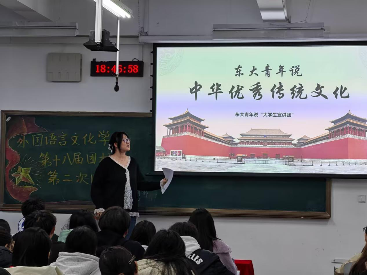 为深化爱国主义教育,引导学员理解个人成长与时代责任的深刻联系,11月2日,我院第十八届团校在工学馆119室举办第二次主题团课。本次团课有机融合了“中华优秀传统文化”与“大学生应征入伍政策”两大内容,特邀东大青年说宣讲团代表宁玫含、国防教育协会宣讲团代表杨磊担任主讲。