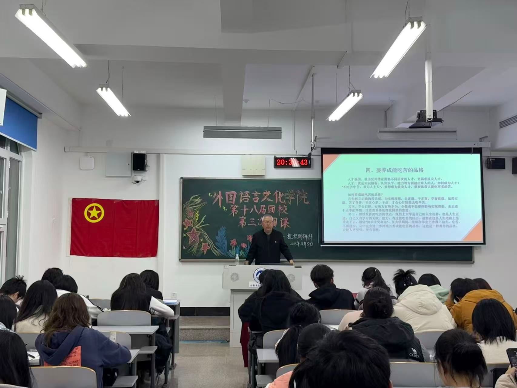 11月9日,我院第十八届团校第三次团课于工学馆104室正式开讲。本次团课特邀学校关心下一代工作委员会(以下简称“关工委”)成员李立峰老师担任主讲,以“青春逢盛世,奋斗正当时”为主题,围绕青年成长成才与使命担当展开系统讲解,为全体学员带来一场深刻的思想启迪。