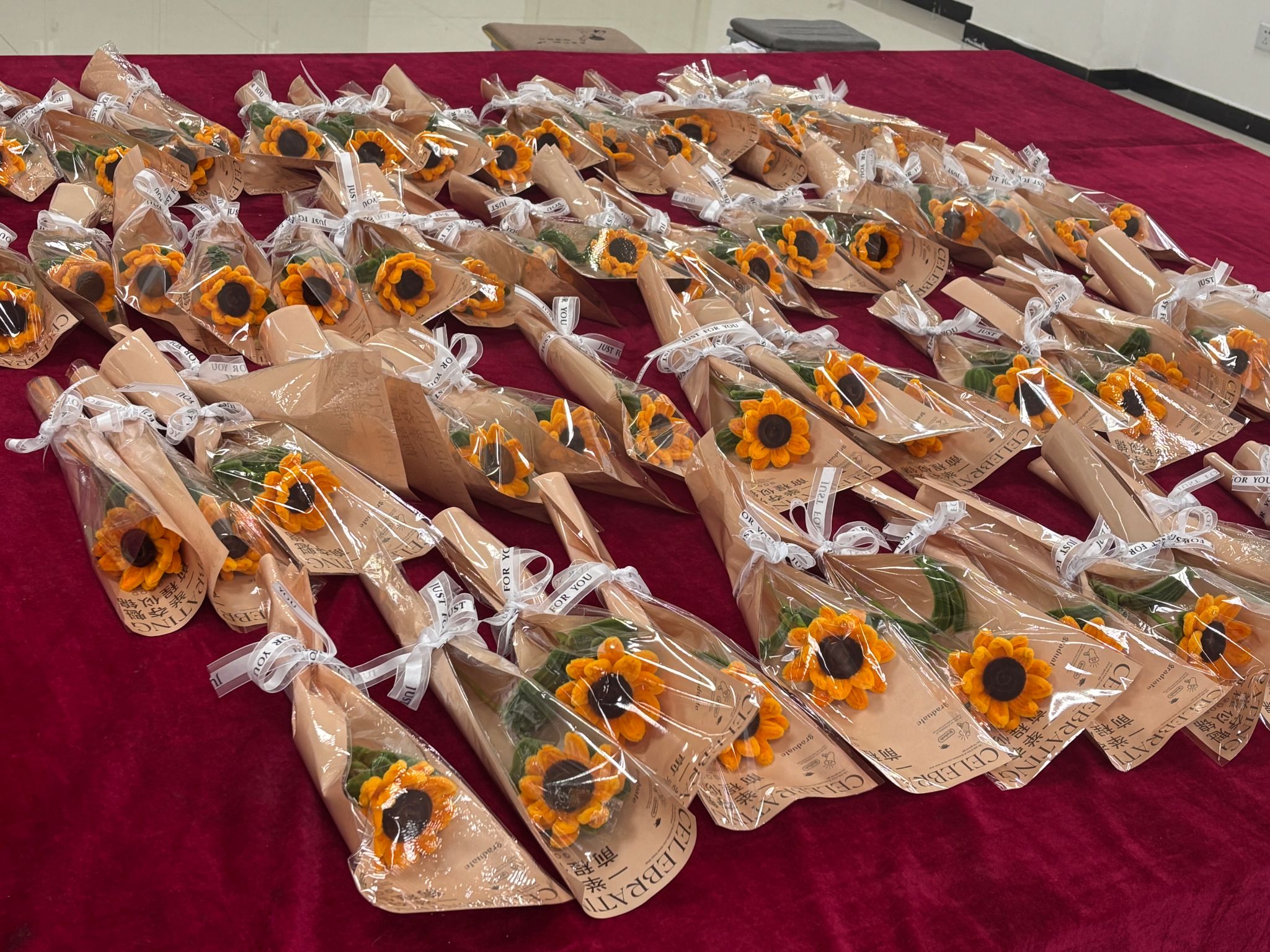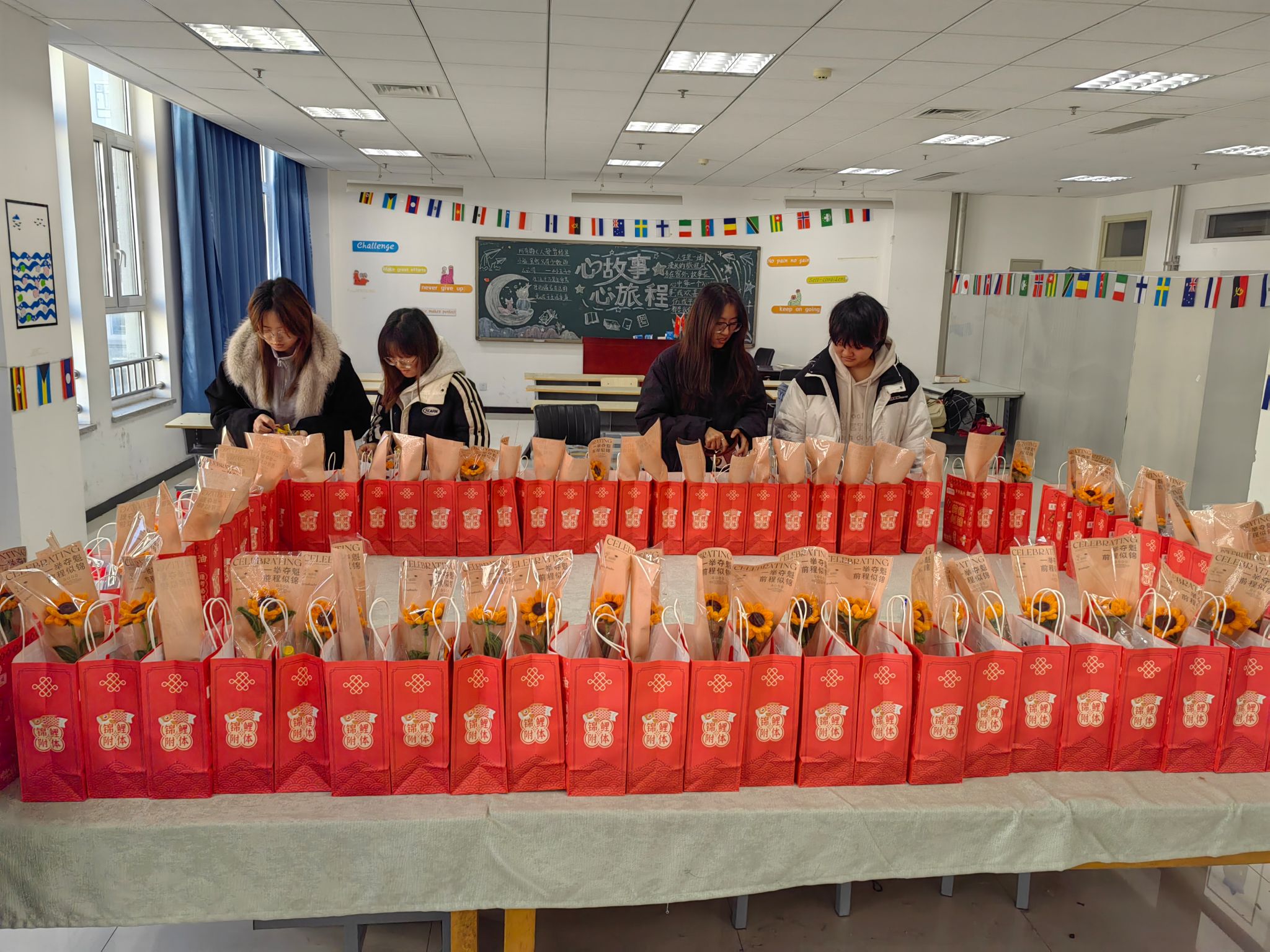 活动现场还播放了特别录制的祝福视频,学长学姐、学弟学妹们通过镜头传递着对考研学子的支持与期待。随后,学院的老师们亲自为大家送上了精心准备的考研暖心大礼包。礼包中不仅有实用的文具用品,还有寓意深长的手工向日葵、"心想事成"的橙子、"旺旺"系列的零食以及学弟学妹们手写的祝福贺卡。每一件礼物都承载着学院师生对考研学子最美好的祝愿。