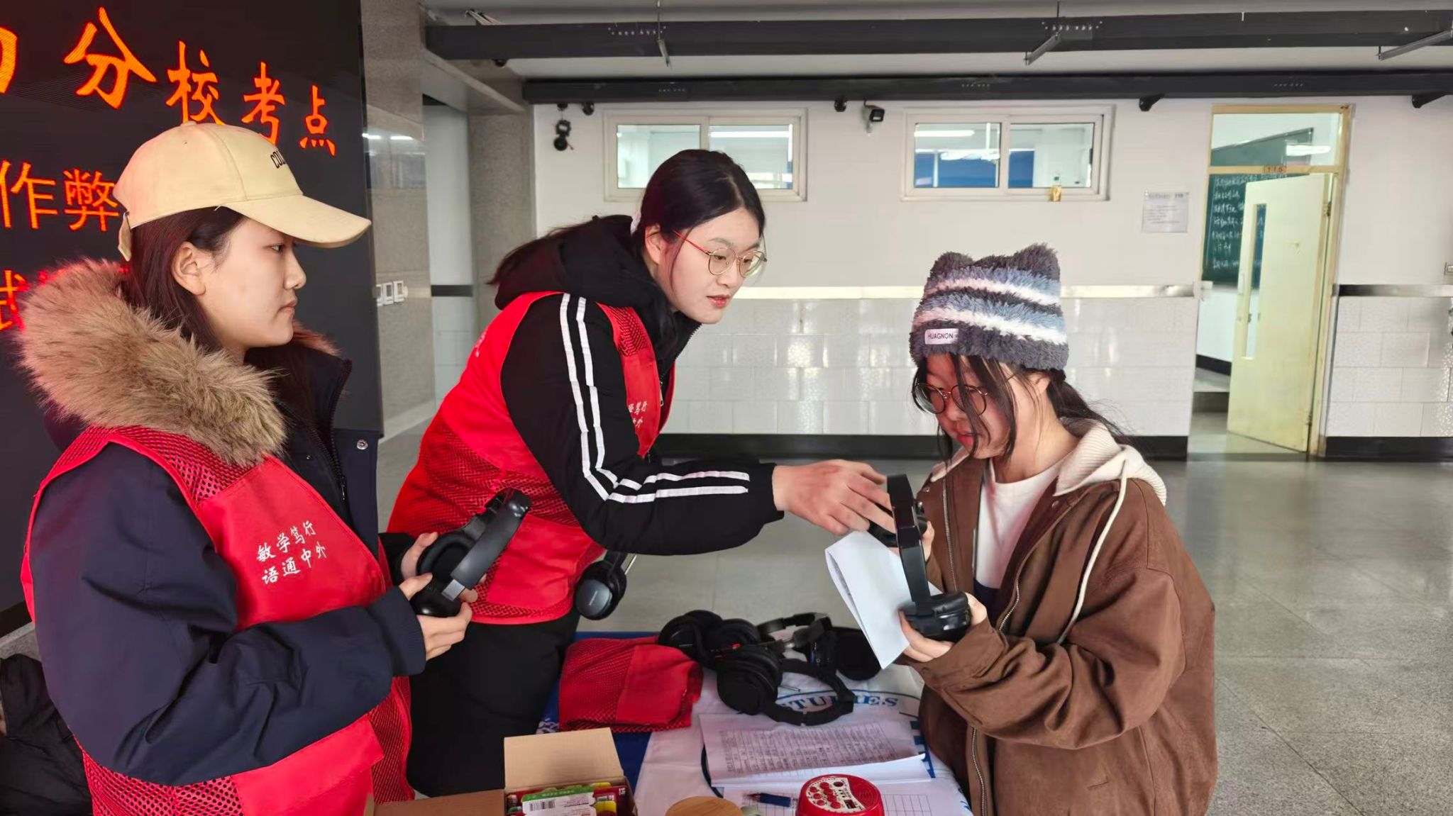 开考前,党员志愿者们提前到岗,认真布置服务站点,为考生提供咨询与物品协助。她们认真清点、核查物资,协助调试听力设备,全力保障考试各环节顺畅有序。考试结束后,志愿者们及时整理回收物资,逐一核对清单,展现出高效严谨、踏实细致的工作风貌,保障了四、六级考试后勤任务的顺利完成,为考生提供了切实的便利与支持。