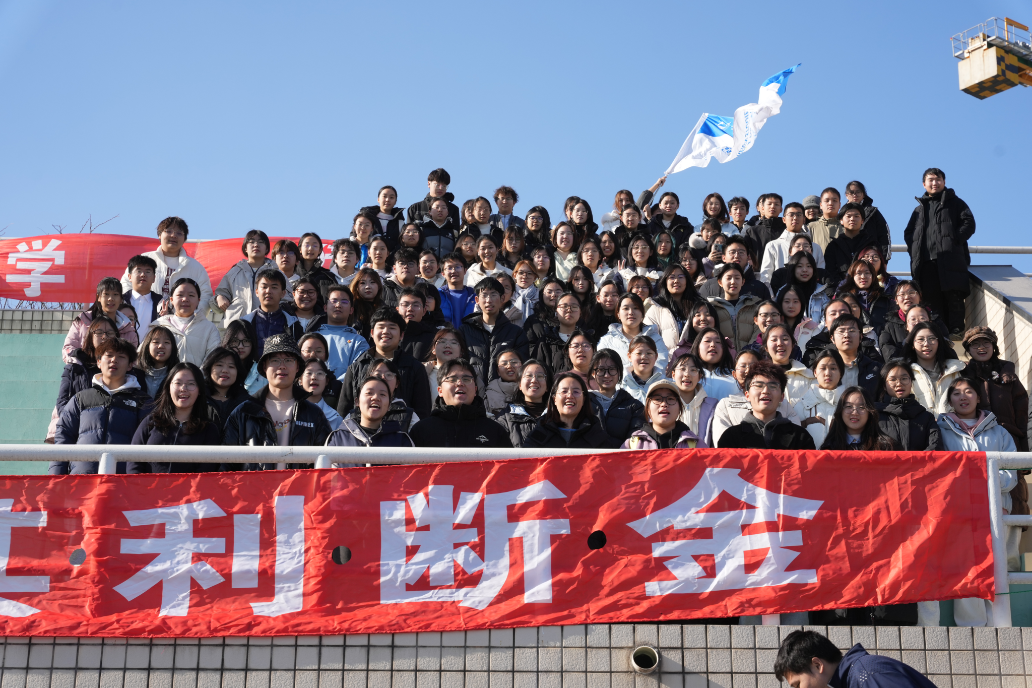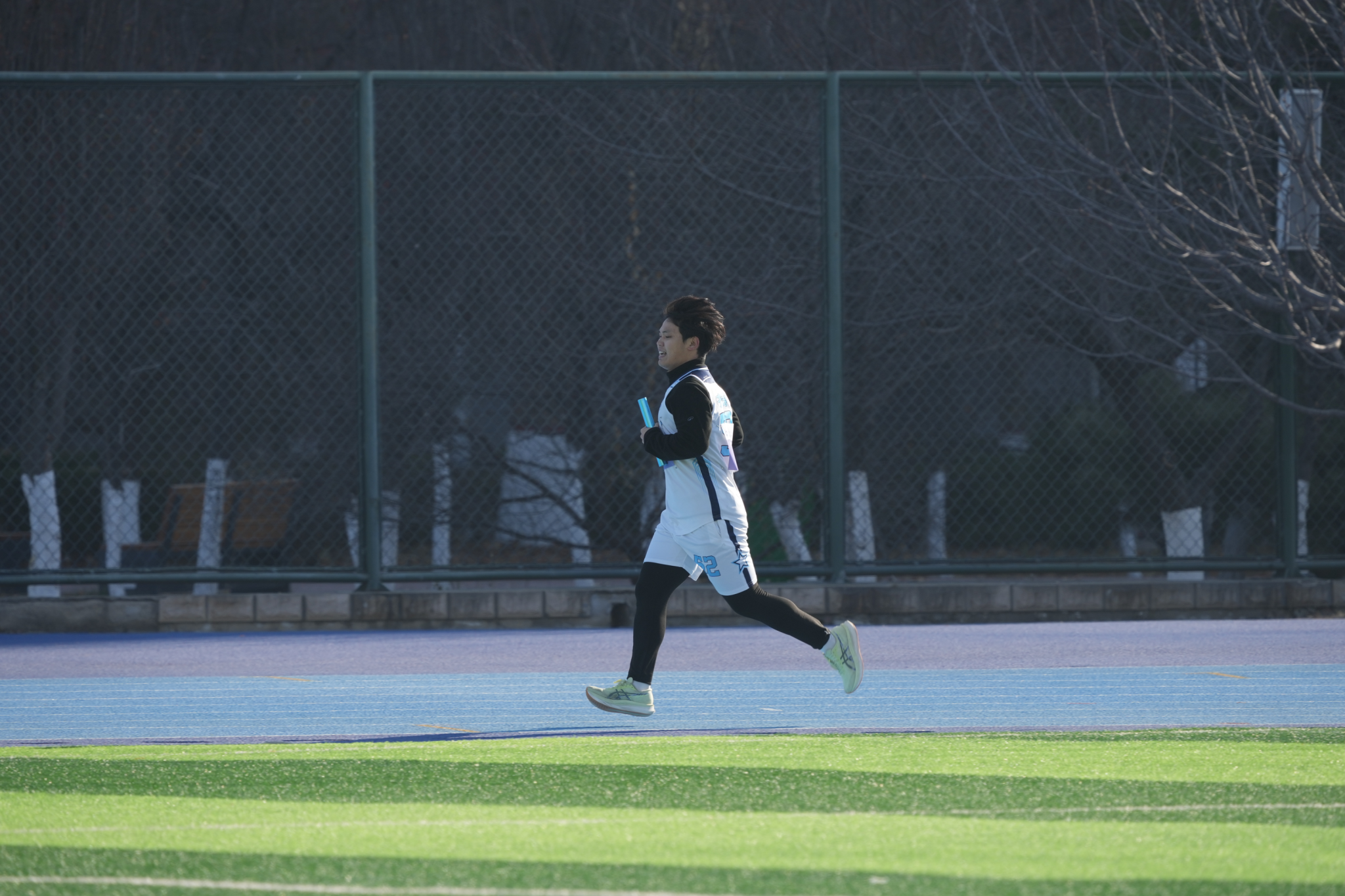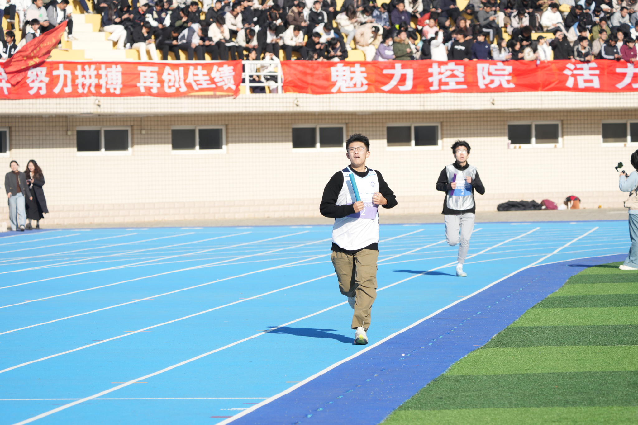 随着发令枪响,参赛队伍奋勇争先,赛道瞬间成为青春竞技的舞台。我院运动员身着统一运动服,步伐矫健、斗志昂扬,在接力传递中默契配合、奋力追赶。赛道旁,我院学子组成的助威团高举标语牌,齐声呐喊加油,激昂的口号穿透寒风,为运动员注入满满动力。