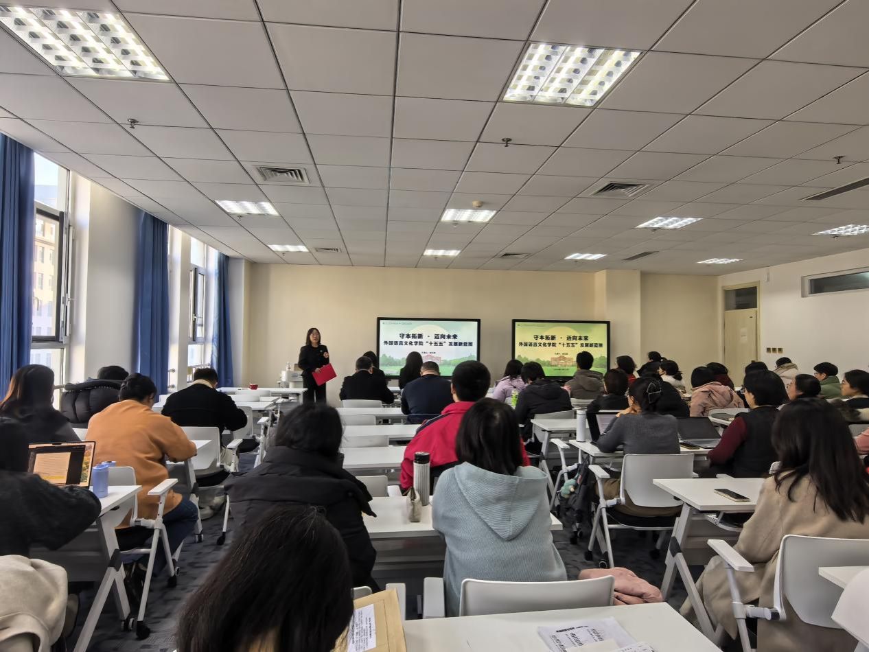 1月15日上午,外国语言文化学院2026年第一次教职工大会在人文楼540召开。本次会议的主要任务是深入贯彻落实党的二十届四中全会精神,全面加强新时代师德师风建设,紧密对接国家战略需求与学校发展部署,系统谋划学院“十五五”发展规划的战略方向、核心路径与重点任务,动员全院教职工守本拓新、凝心聚力,共同开启学院高质量发展新征程。行政副院长张拓主持会议,全院教职工参加会议。