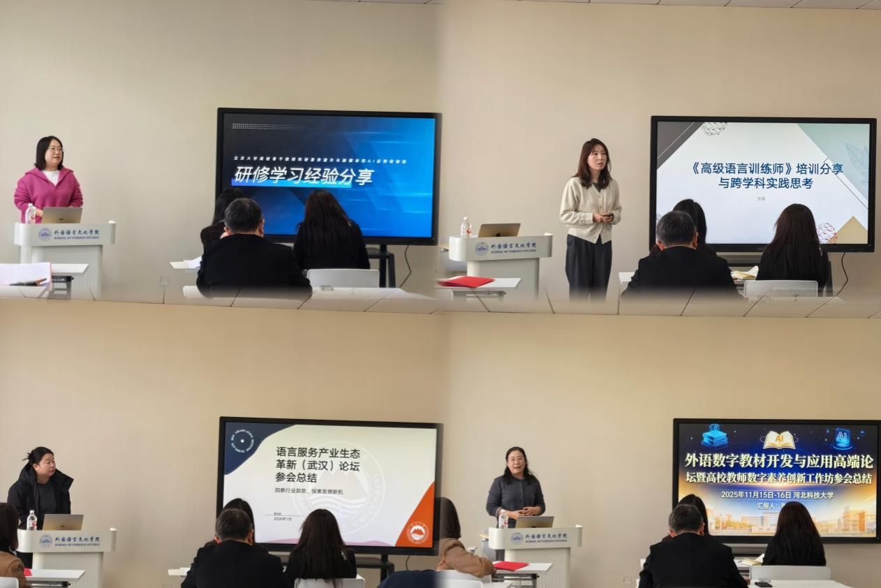 会议期间,外出研修教师代表紧扣学科前沿与产业需求,分别围绕高级语言训练与跨学科实践、语言服务产业生态革新、外语数字教材开发及AI赋能科研素养等核心议题作汇报交流。教师们的分享洞察行业趋势,探索发展新机,为全院深化产教融合、推动教育教学与科研范式的数智化转型提供了前瞻性视野与实践路径。